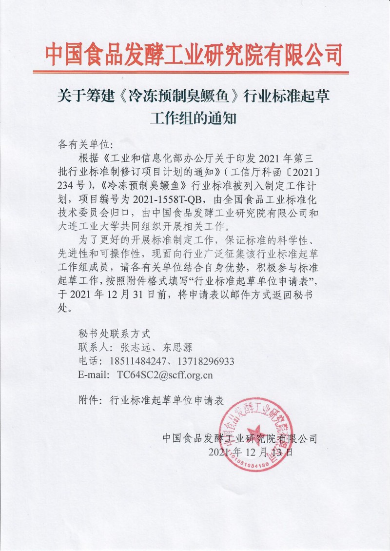 核心提示:中國食品發酵工業研究院有限公司關于籌建《冷凍預制臭鱖魚》行業標準起草工作組的通知。