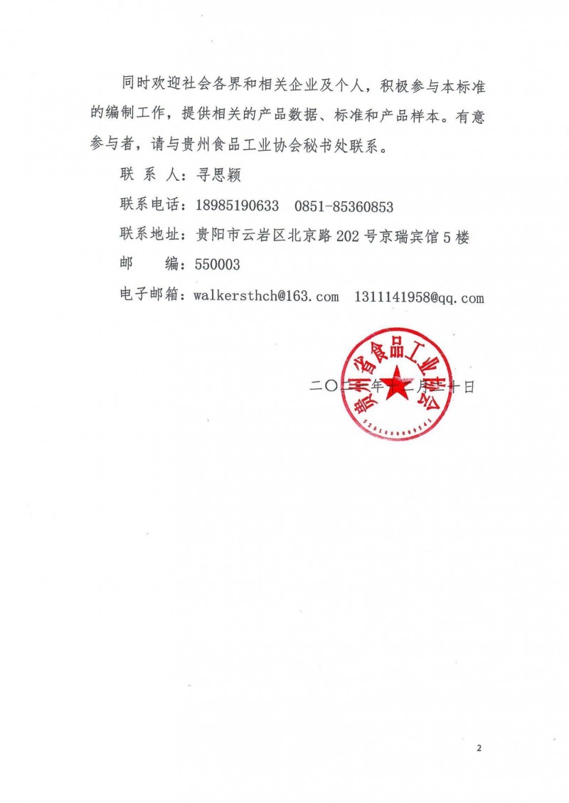 同時歡迎社會各界和相關企業及個人,積極參與本標準的編制工作,提供相關的產品數據、標準和產品樣本。有意參與者,請與貴州食品工業協會秘書處聯系。