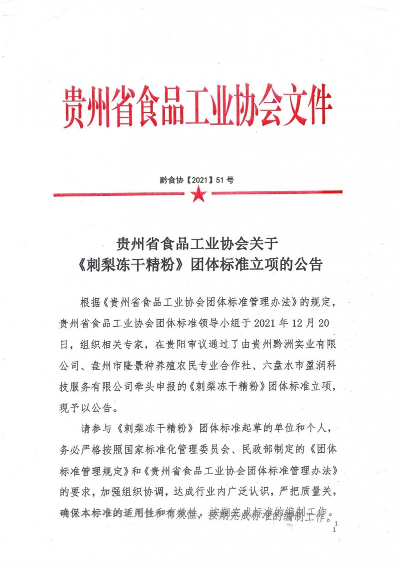 根據《貴州省食品工業協會團體標準管理辦法》的規定,貴州省食品工業協會團體標準領導小組于2021年12月20日,組織相關專家,在貴陽審議通過了由貴州黔洲實業有限公司、盤州市隆景種養殖農民專業合作社、六盤水市盈潤科技服務有限公司牽頭申報的《刺梨凍干精粉》團體標準立項,現予以公告。