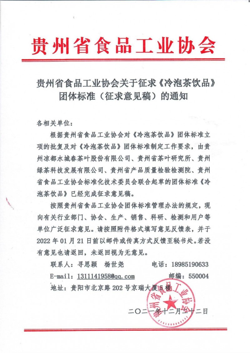 根據(jù)貴州省食品工業(yè)協(xié)會(huì)對(duì)《冷泡茶飲品》團(tuán)體標(biāo)準(zhǔn)立項(xiàng)的批復(fù)及對(duì)《冷泡茶飲品》團(tuán)體標(biāo)準(zhǔn)制定工作要求,由貴州涼都水城春茶葉股份有限公司、貴州省茶葉研究所、貴州綠茶科技發(fā)展有限公司、貴州省產(chǎn)品質(zhì)量檢驗(yàn)檢測(cè)院、貴州省食品工業(yè)協(xié)會(huì)標(biāo)準(zhǔn)化技術(shù)委員會(huì)聯(lián)合起草的團(tuán)體標(biāo)準(zhǔn)《冷泡茶飲品》已經(jīng)完成征求意見稿。