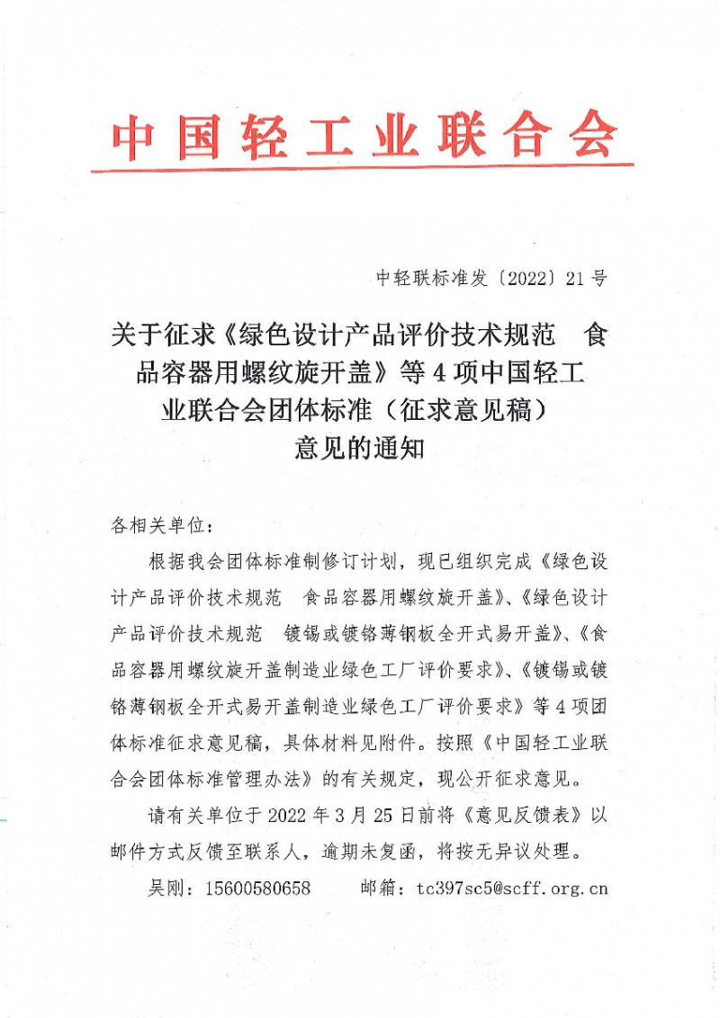 1、1-《綠色設計產品評價技術規范 食品容器用螺紋旋開蓋》團體標準(征求意見稿)