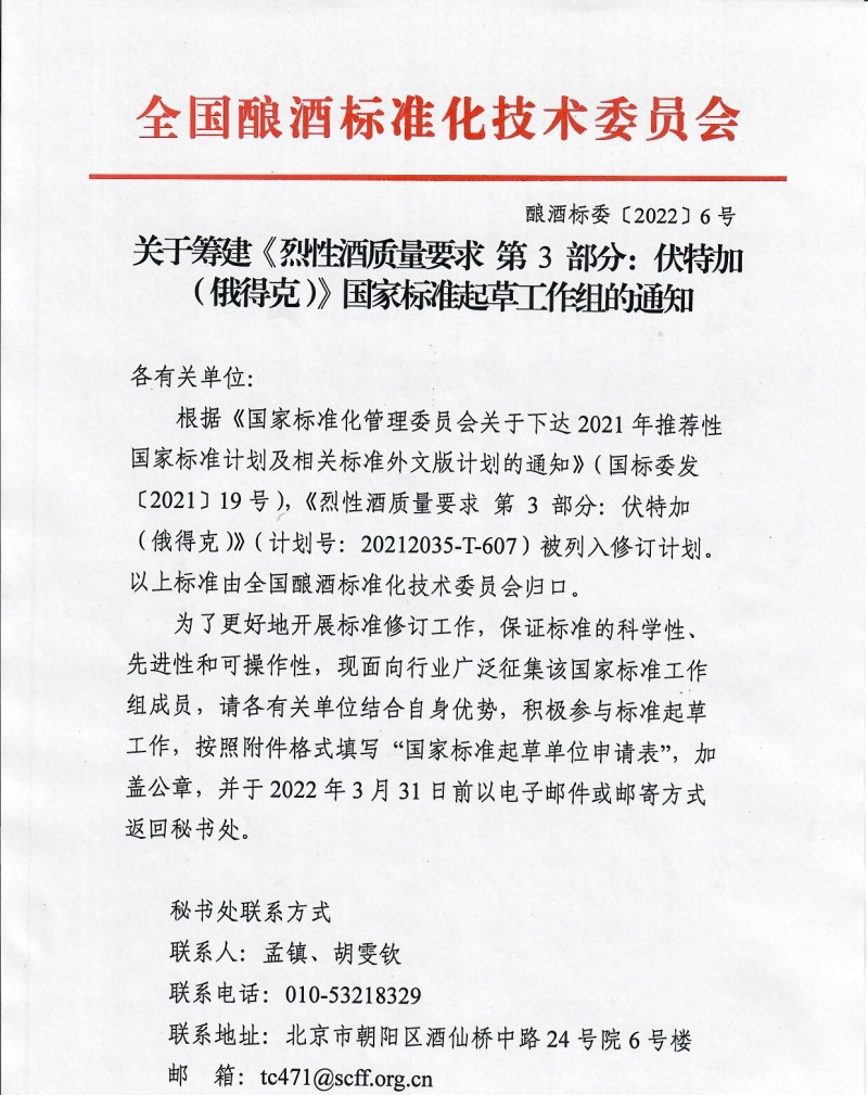 下載中心首頁 » 動態公告 » 標準動態 » 全國釀酒標準化技術委員會關于籌建《烈性酒質量要求 第 3 部分:伏特加(俄得克)》國家標準起草工作組的通知(釀酒標委〔2022〕6號)