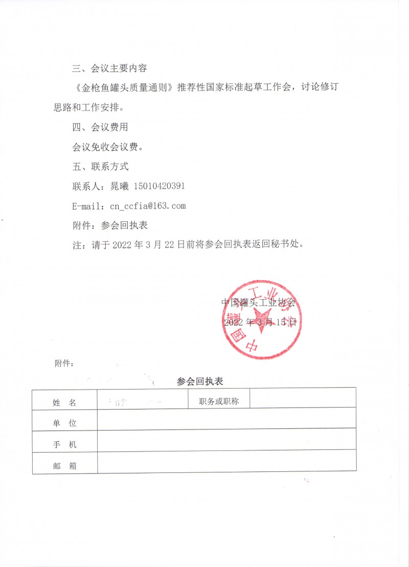中國罐頭工業(yè)協(xié)會關(guān)于召開《金槍魚罐頭質(zhì)量通則》國家標準第二次起草工作會的通知(中罐協(xié)【2022】第13號)