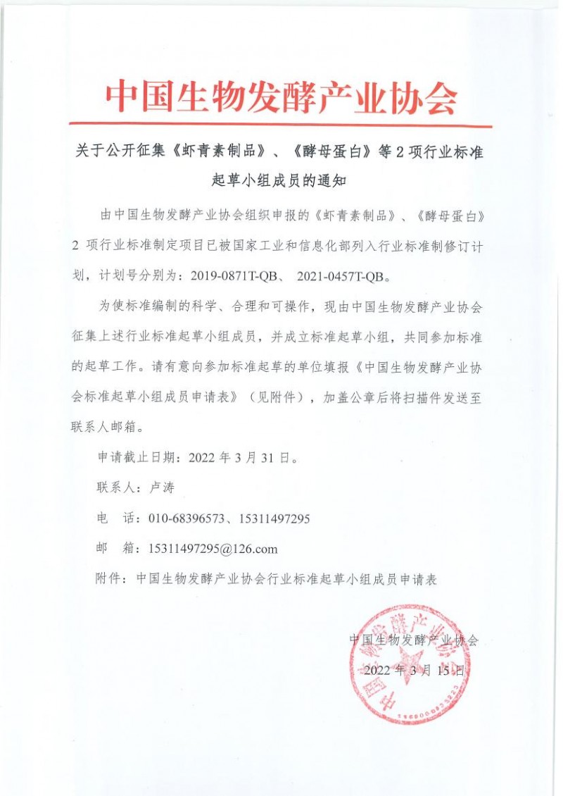 中國生物發酵產業協會關于公開征集《蝦青素制品》、《酵母蛋白》等2項行業標準起草小組成員的通知