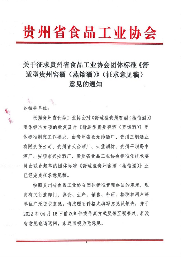 根據貴州省食品工業協會對《舒適型貴州窖酒(蒸餾酒)》團體標準立項的批復及對《舒適型貴州窖酒(蒸餾酒)》團體標準制定工作要求,由貴州省金元帥酒廠、貴州三綱酒業有限責任公司、貴州省天臺酒廠、云堡酒坊、貴州平壩黔中酒廠、安順市興安酒廠、貴州省食品工業協會標準化技術委員會聯合起草的團體標準《舒適型貴州窖酒(蒸餾酒)》業已經完成征求意見稿。