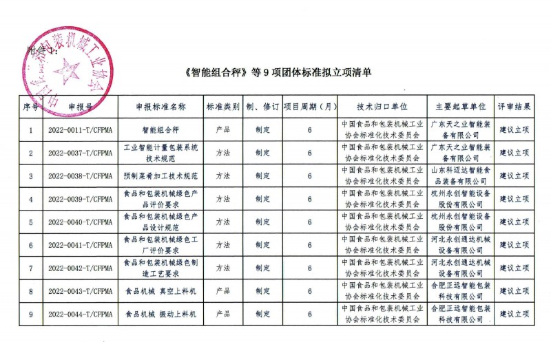 根據協會標準化工作安排,按照《中國食品和包裝機械工業協會團體標準管理辦法》,中國食品和包裝機械工業協會標準化技術委員會秘書處針對《智能組合秤》等9項團體標準立項建議開展了立項審查工作。經標委會委員認真審查并投票表決,擬同意《智能組合秤》等9項團體標準項目立項,現將擬立項標準予以公示(詳見附件1:《智能組合秤》等9項團體標準擬立項清單)。