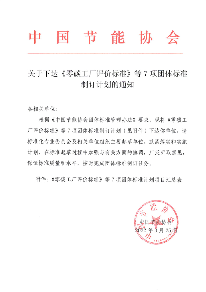 中國節能協會關于下達《零碳工廠評價標準》等7項團體標準制訂計劃的通知