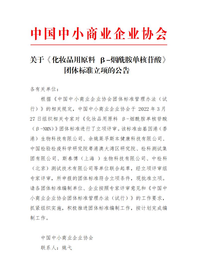 根據《中國中小商業企業協會團體標準管理辦法(試行)》的相關規定,中國中小商業企業協會于 2022年3月27日組織相關專家對《化妝品用原料 β-煙酰胺單核苷酸(β-NMN)》團體標準進行了立項評審。該標準由基因港(香港)生物科技有限公司、余姚萊孚斯本健康科技有限公司、中國檢驗檢疫科學研究院粵港澳大灣區研究院、檢科測試集團有限公司、斯泰博(上海 )生物科技有限公司、中檢科(北京)測試技術有限公司等單位聯合起草,經立項評審組專家評審,所申報的團體標準符合立項條件,現批準立項。請各團體標準編制單位、企業按照專家評審意見和《中國中小商業企業協會團體標準管理辦法(試行)》的工作要求,抓緊組織實施,積極推進團體標準編制工作,按計劃完成編制工作。