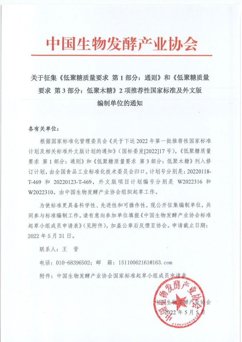 核心提示:中國生物發酵產業協會關于征集《低聚糖質量要求 第1部分:通則》和《低聚糖質量要求 第3部分:低聚木糖》2項推薦性國家標準及外文版編制單位的通知,申請截止日期:2022年5月31日。