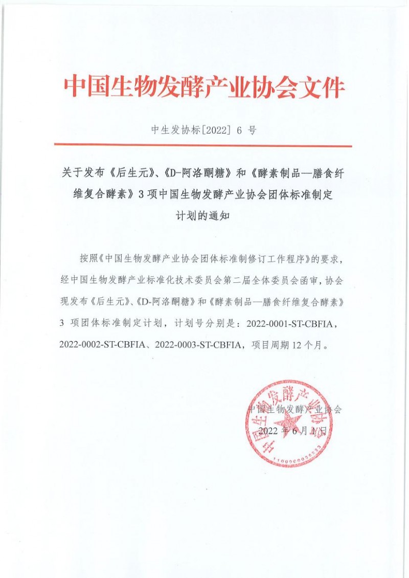 中國生物發酵產業協會關于發布《后生元》、《D-阿洛酮糖》和《酵素制品—膳食纖維復合酵素》3項中國生物發酵產業協會團體標準制定計劃的通知(中生發協標[2022]6號)