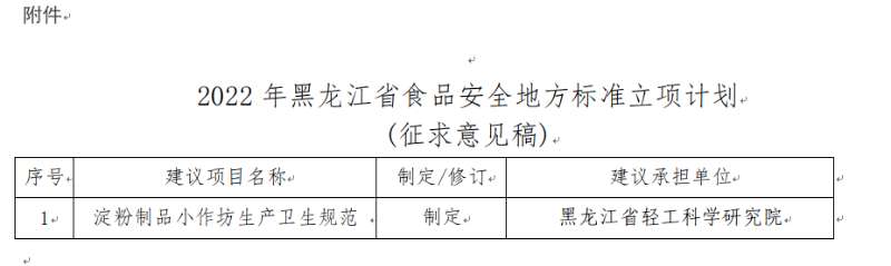 根據(jù)《中華人民共和國食品安全法》《黑龍江省食品安全條例》規(guī)定,為做好我省食品安全地方標準制修訂工作,經(jīng)向社會廣泛征集意見,在對收到的食品安全地方標準立項申請研究論證的基礎(chǔ)上,我委擬定了《2022年黑龍江省食品安全地方標準立項計劃(征求意見稿)》。現(xiàn)向社會公開征求意見,如有意見請于2022年6月30日前將意見書面反饋我委。