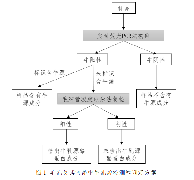 針對羊乳及乳制品檢測時,首先采用《乳及乳制品中牛(家牛、牦牛和水牛)和羊(山羊和綿羊)源性成分定性檢測方法實時熒光PCR法》作為初篩方法,采用本標準建立的牛(牛、水牛和牦牛)或家牛乳源成分對樣品中牛源性成分進行檢測。若未檢出牛基因成分,則判定羊乳制品中不含有牛乳成分;如檢出牛基因成分,則進一步采用標準《乳及乳制品中牛乳酪蛋白成分定性檢測毛細管凝膠電泳法》確證產品的蛋白成分來源,判定牛基因檢測陽性的樣品是否含有來源于牛乳酪蛋白,進而對樣品的真實性進行判定,兩種方法聯合檢測解決了以往乳制品檢測中因配料復雜、乳源判別困難的瓶頸問題,技術路線圖如下圖1所示: