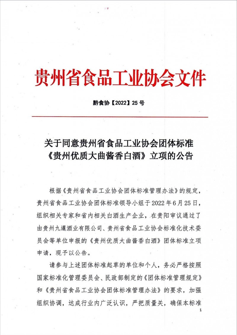 根據(jù)《貴州省食品工業(yè)協(xié)會團體標準管理辦法》的規(guī)定,貴州省食品工業(yè)協(xié)會團體標準領(lǐng)導(dǎo)小組于2022年6月25日,組織相關(guān)專家和省內(nèi)相關(guān)白酒生產(chǎn)企業(yè),在貴陽審議通過了由貴州九暹酒業(yè)有限公司、貴州省食品工業(yè)協(xié)會標準化技術(shù)委員會等單位申報的《貴州優(yōu)質(zhì)大曲醬香白酒》團體標準立項,現(xiàn)予以公告。