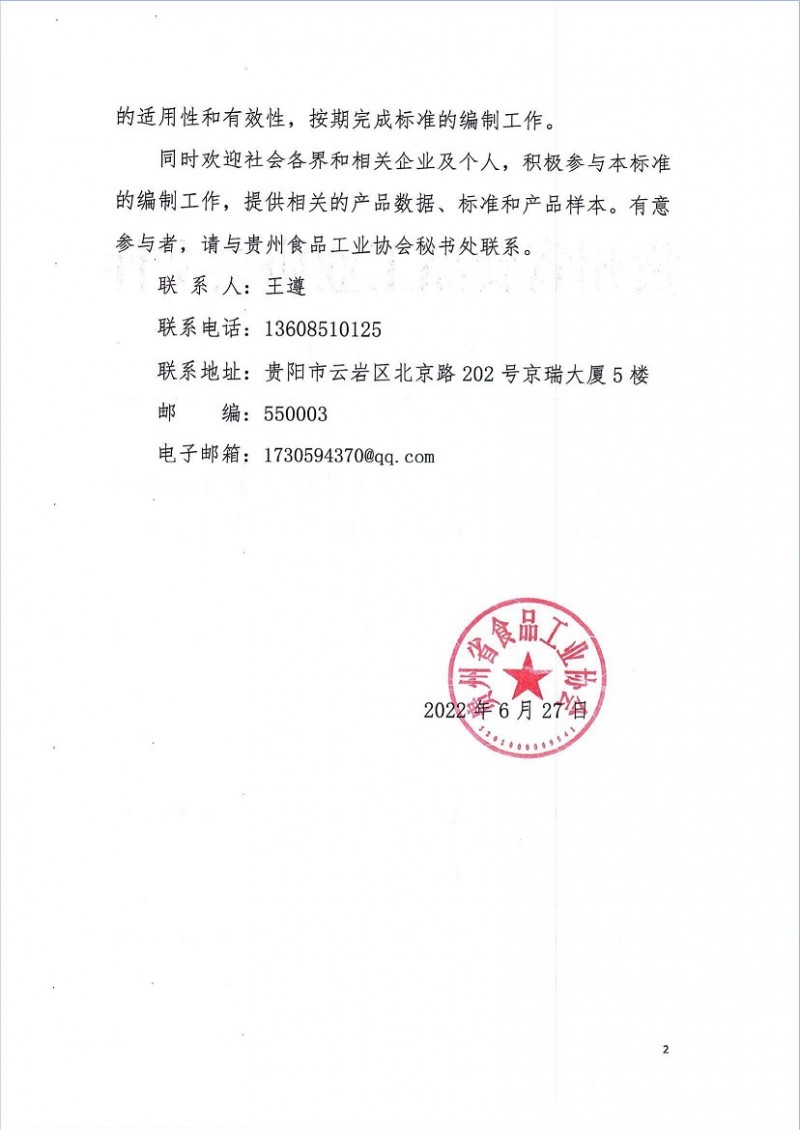 同時歡迎社會各界和相關(guān)企業(yè)及個人,積極參與本標準的編制工作,提供相關(guān)的產(chǎn)品數(shù)據(jù)、標準和產(chǎn)品樣本。有意參與者,請與貴州食品工業(yè)協(xié)會秘書處聯(lián)系。