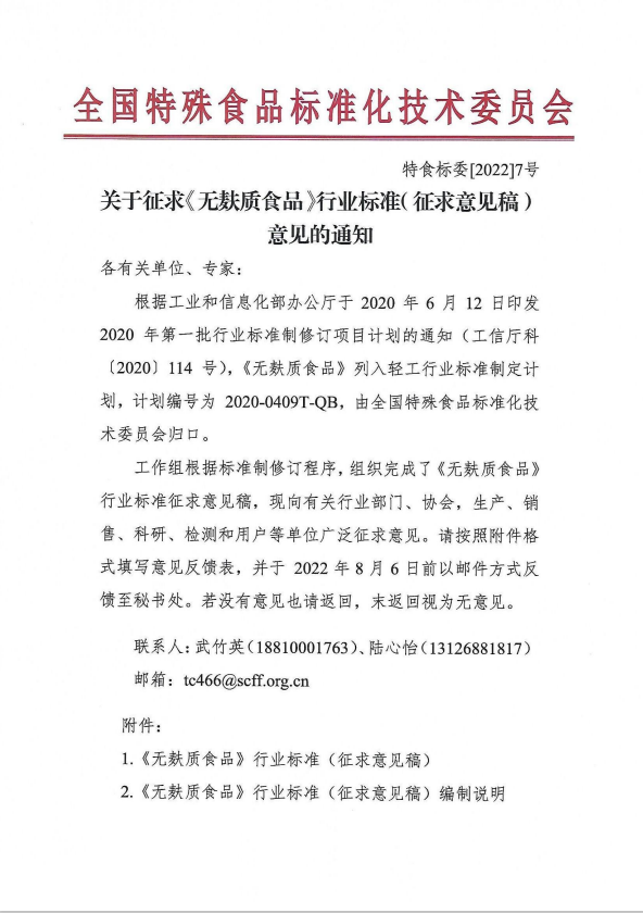 核心提示:全國特殊食品標準化技術委員會關于征求《無麩質食品》行業標準(征求意見稿)意見的通知,反饋截止日期2022-08-06.