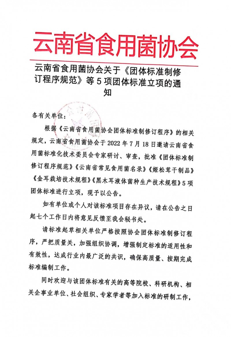根據《云南省食用菌協會團體標準制修訂程序》的相關規定,云南省食用菌協會于2022年7月18日邀請云南省食用菌標準化技術委員會專家研討、審查,批準《團體標準制修訂程序規范》《云南省常見食用菌名錄》《姬松茸干制品》《金耳栽培技術規程》《黑木耳液體菌種生產技術規程》5項團體標準進行立項,現予以公告。