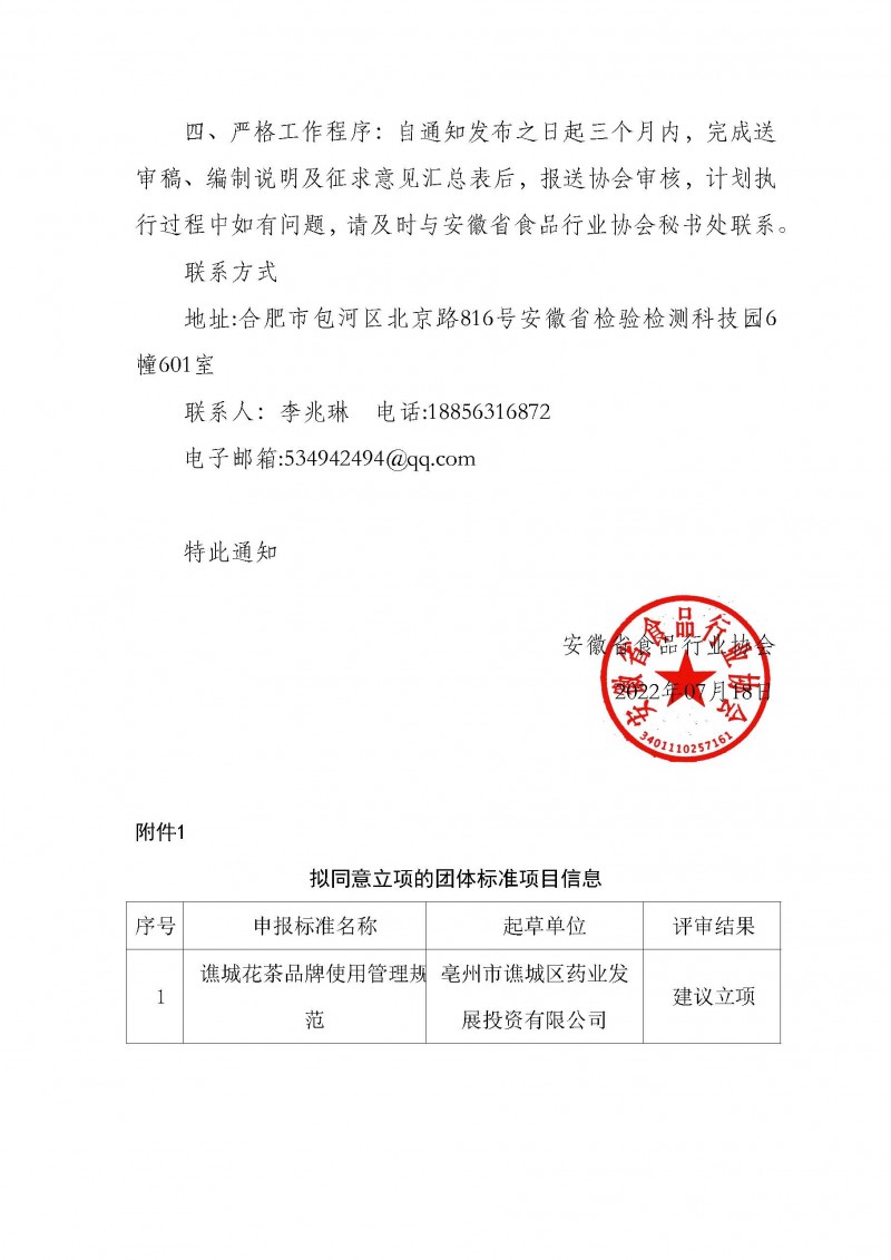 安徽省食品行業協會關于下達《譙城花茶品牌使用管理規范》團體標準立項的通知(皖食協[2022]22號)