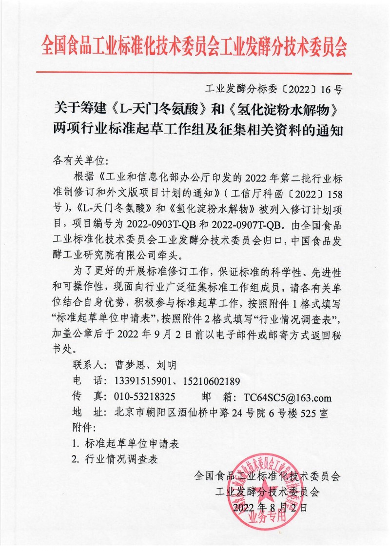 全國食品工業標準化技術委員會工業發酵分技術委員會關于籌建《L-天門冬氨酸》和《氫化淀粉水解物》兩項行業標準起草工作組及征集相關資料的通知