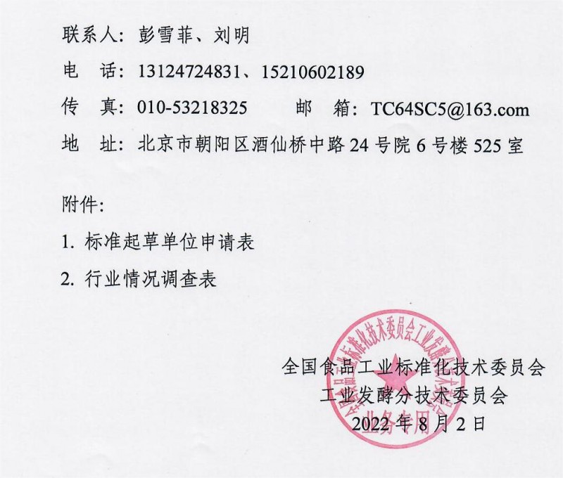 核心提示:全國食品工業標準化技術委員會工業發酵分技術委員會關于籌建《發酵工業用營養物質通用技術規范》、《天貝》和《啤酒用糖漿》等三項行業標準起草工作組及征集相關資料的通知。截止日期2022-09-02.