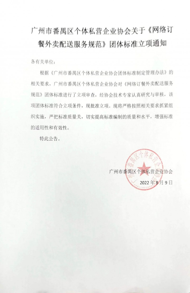 根據《廣州市番禺區個體私營企業協會團體標準制定管理辦法》的相關要求,廣州市番禺區個體私營企業協會對《網絡訂餐外賣配送服務規范》團體標準進行了立項審查,經協會技術專家認真研究與審核,該項團體標準符合立項條件,現批準立項,F將嚴格按照相關要求抓緊組織實施,嚴把標準質量關,切實提高標準編制的質量和水平,增強標準的適用性和有效性。