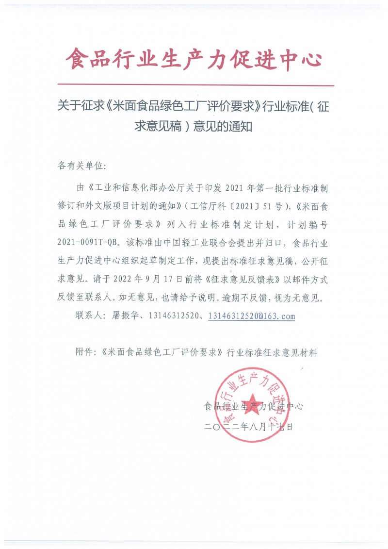 食品行業生產力促進中心關于征求《米面食品綠色工廠評價要求》行業標準(征求意見稿)意見的通知
