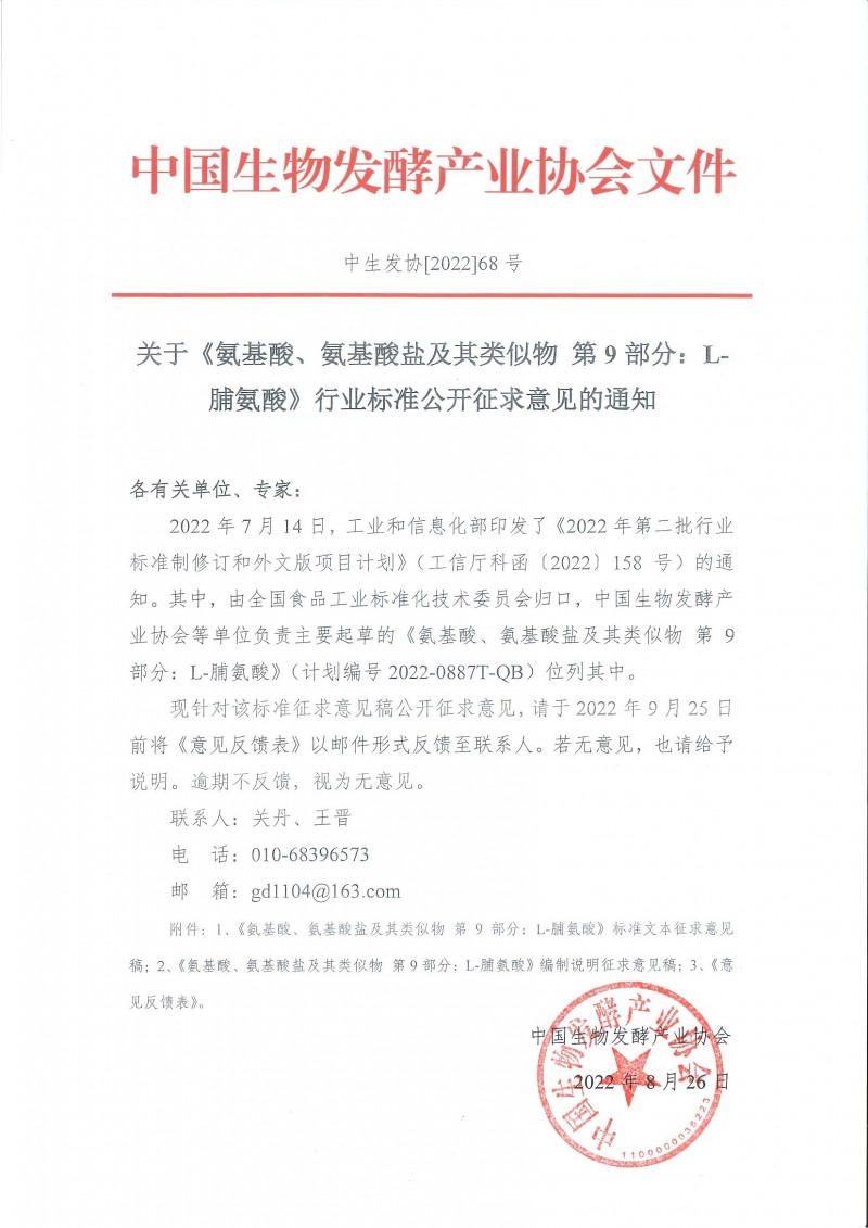 中國生物發(fā)酵產(chǎn)業(yè)協(xié)會關于《氨基酸、氨基酸鹽及其類似物 第9部分:L-脯氨酸》行業(yè)標準公開征求意見的通知(中生發(fā)協(xié)[2022]68號)