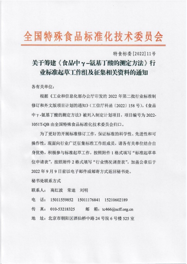 全國特殊食品標準化技術委員會關于籌建《食品中γ-氨基丁酸的測定方法》行業標準起草工作組及征集相關資料的通知