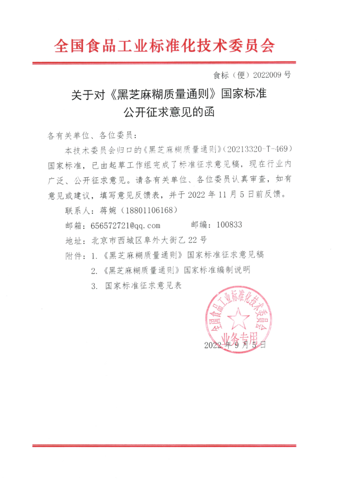 全國食品工業標準化技術委員會關于對《黑芝麻糊質量通則》國家標準公開征求意見的函