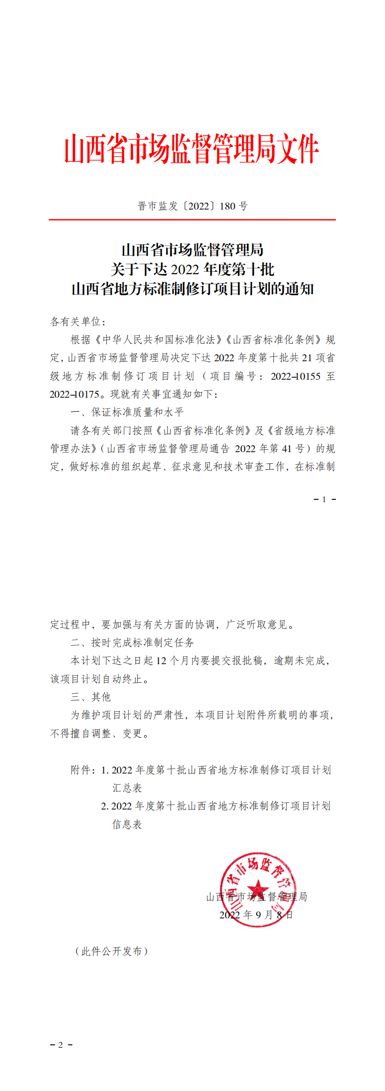 山西省市場監督管理局關于下達2022年度第十批山西省地方標準制修訂項目計劃的通知(晉市監發〔2022〕180號)