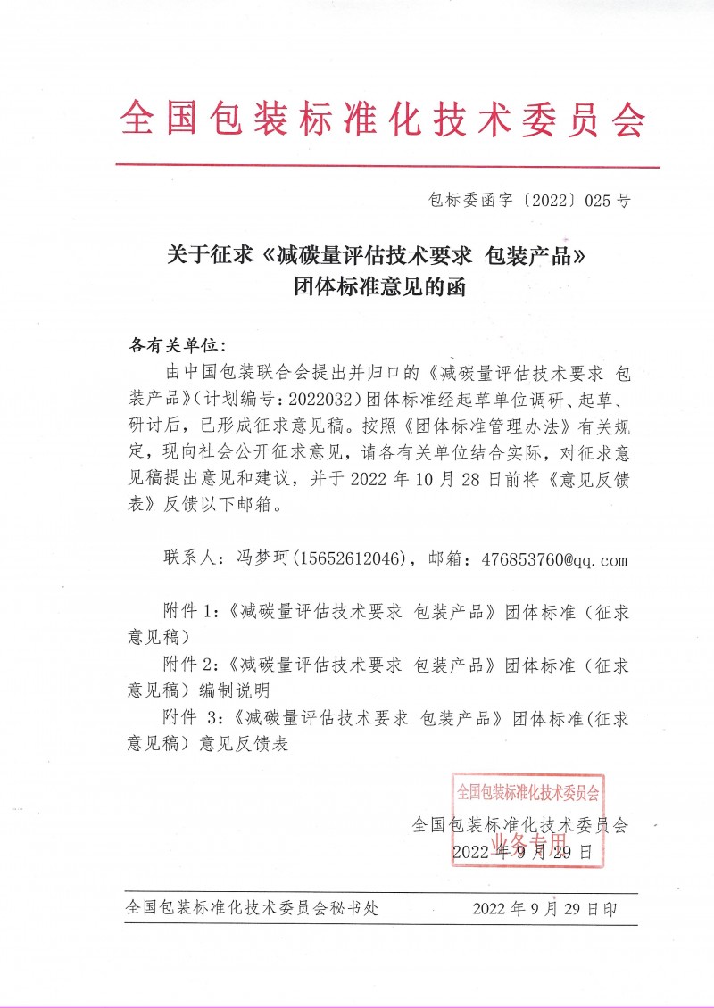 由中國包裝聯(lián)合會提出并歸口的《減碳量評估技術(shù)要求包裝產(chǎn)品》(計劃編號:2022032)團(tuán)體標(biāo)準(zhǔn)經(jīng)起草單位調(diào)研、起草、研討后,已形成征求意見稿。現(xiàn)向社會公開征求意見,截止2022年10月28日前。