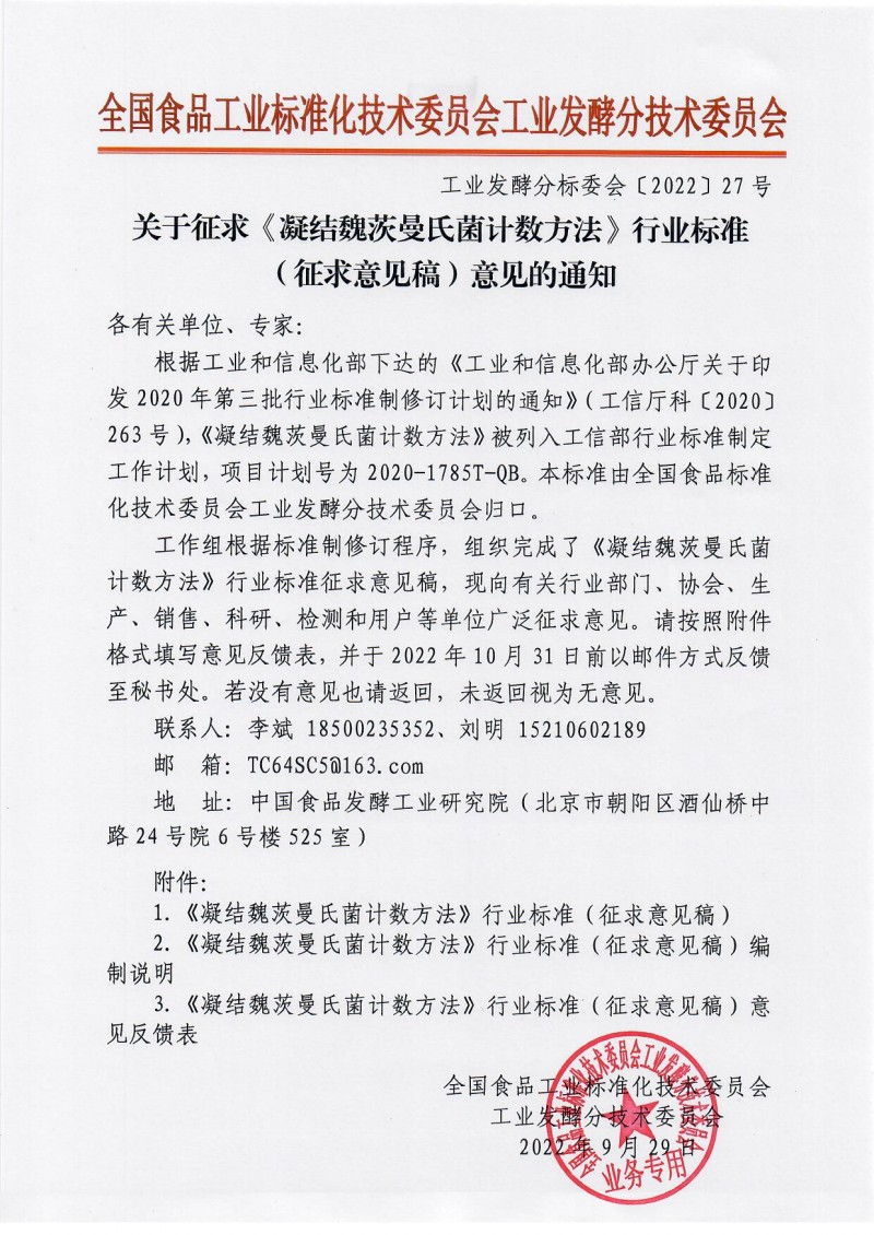 工作組根據(jù)標準制修訂程序,組織完成了《凝結魏茨曼氏菌計數(shù)方法》行業(yè)標準征求意見稿,現(xiàn)向有關行業(yè)部門、協(xié)會、生產(chǎn)、銷售、科研、檢測和用戶等單位廣泛征求意見。請按照附件格式填寫意見反饋表,并于2022年10月31日前以郵件方式反饋至秘書處。若沒有意見也請返回,未返回視為無意見。