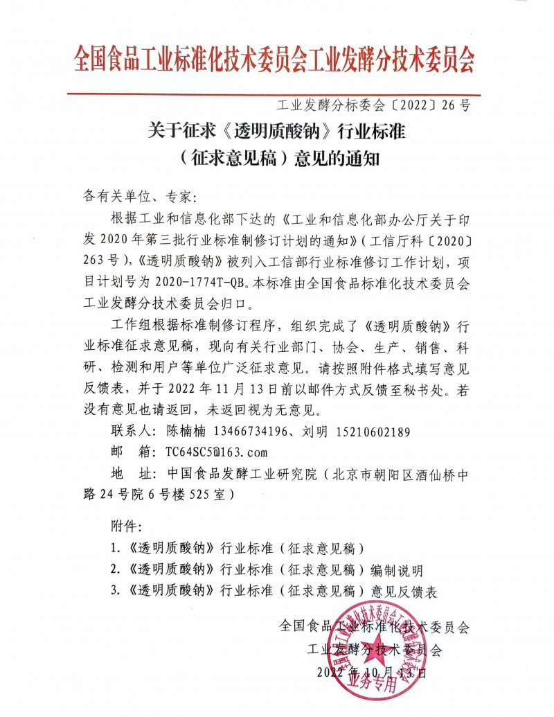 下載中心首頁 » 動態公告 » 標準動態 » 全國食品工業標準化技術委員會工業發酵分技術委員會關于征求《透明質酸鈉》行業標準(征求意見稿)意見的通知
