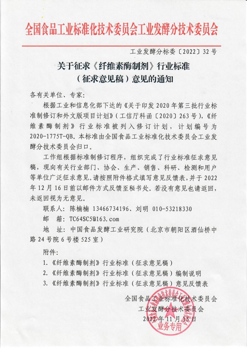 核心提示:全國食品工業標準化技術委員會工業發酵分技術委員會關于征求《纖維素酶制劑》行業標準(征求意見稿)意見的通知,截止時間2022-12-16.