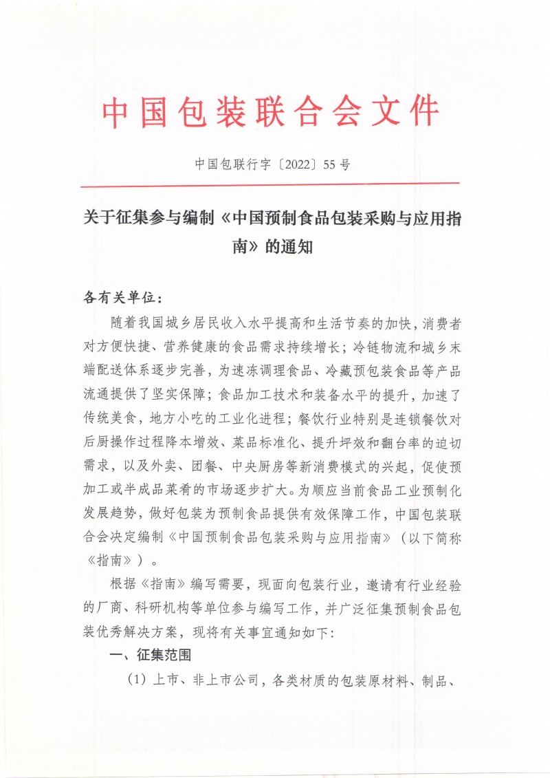 下載中心首頁 » 動態公告 » 標準動態 » 中國包裝聯合會關于征集參與編制《中國預制食品包裝采購與應用指南》的通知