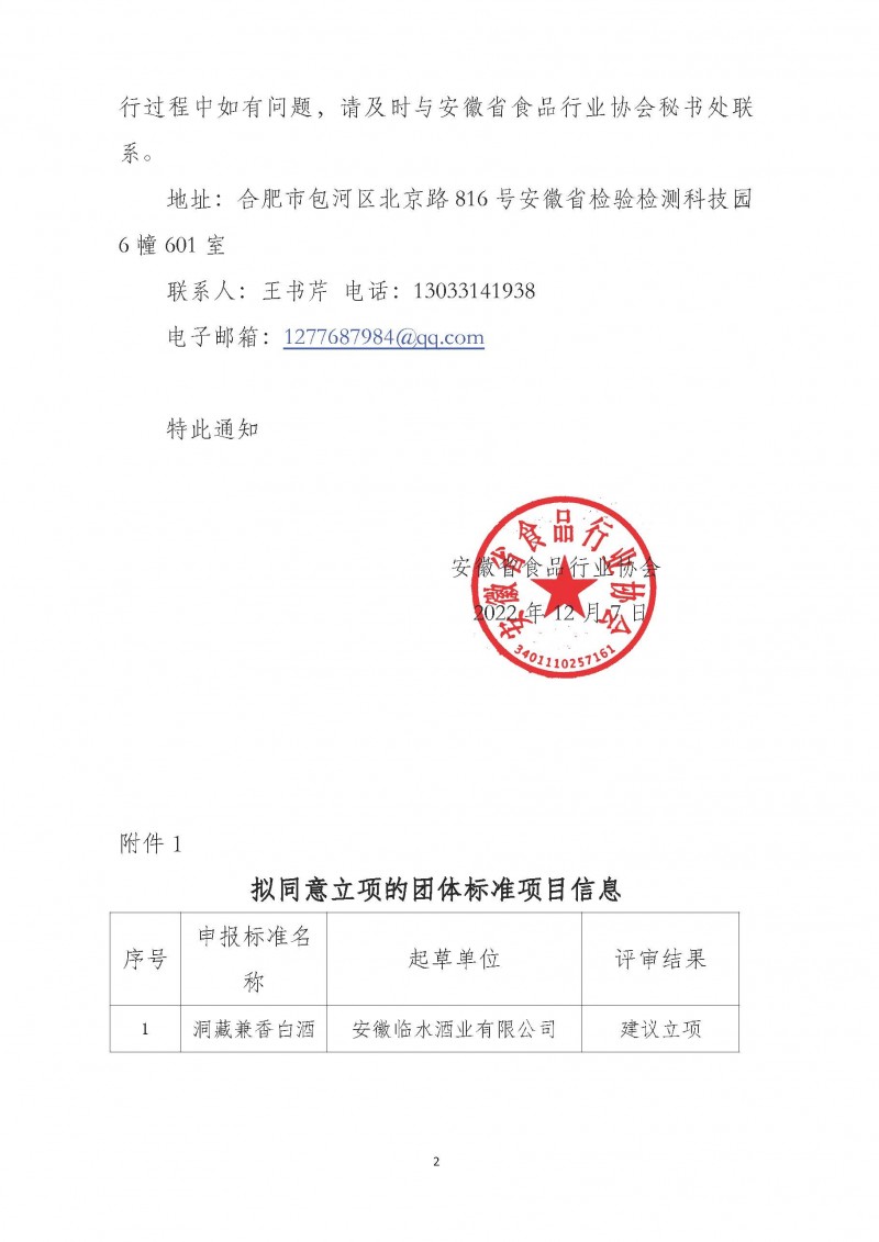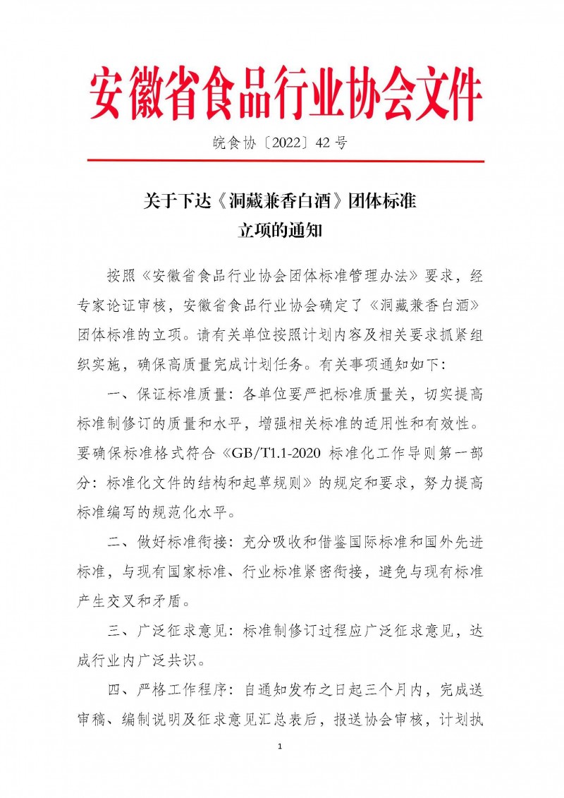 安徽省食品行業(yè)協(xié)會(huì)關(guān)于下達(dá)《洞藏兼香白酒》團(tuán)體標(biāo)準(zhǔn)立項(xiàng)的通知(皖食協(xié)〔2022〕42號(hào))