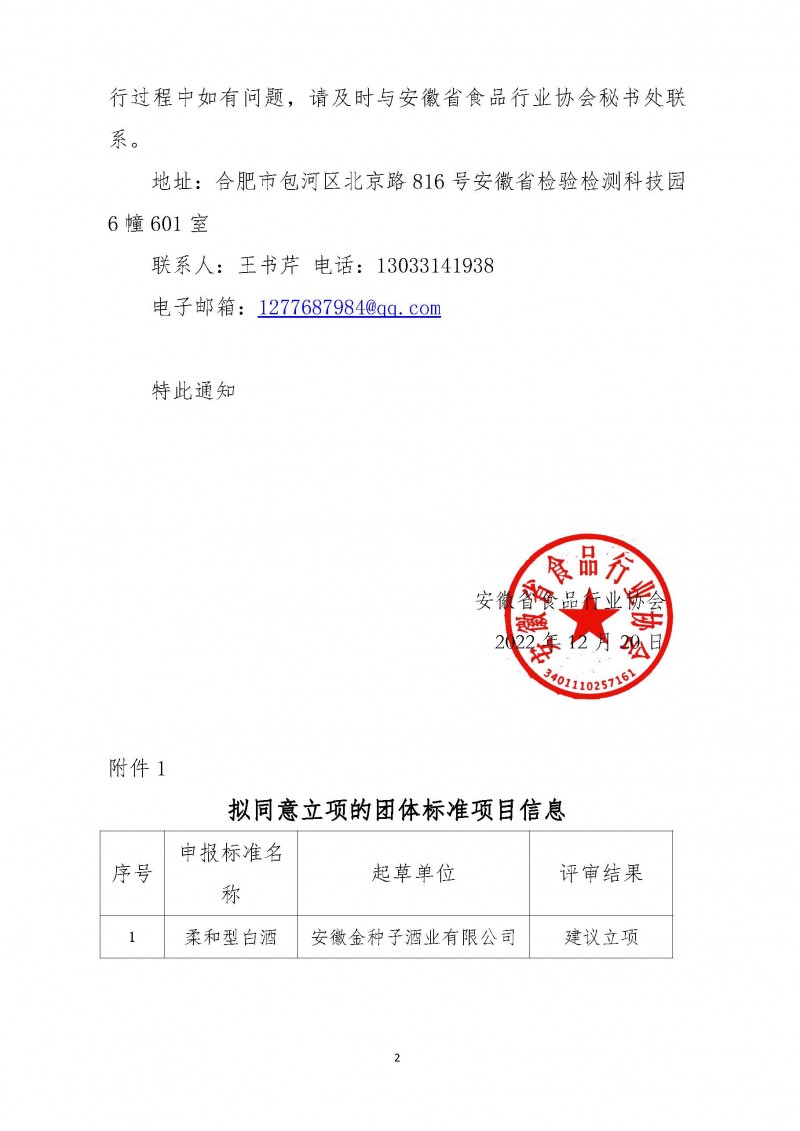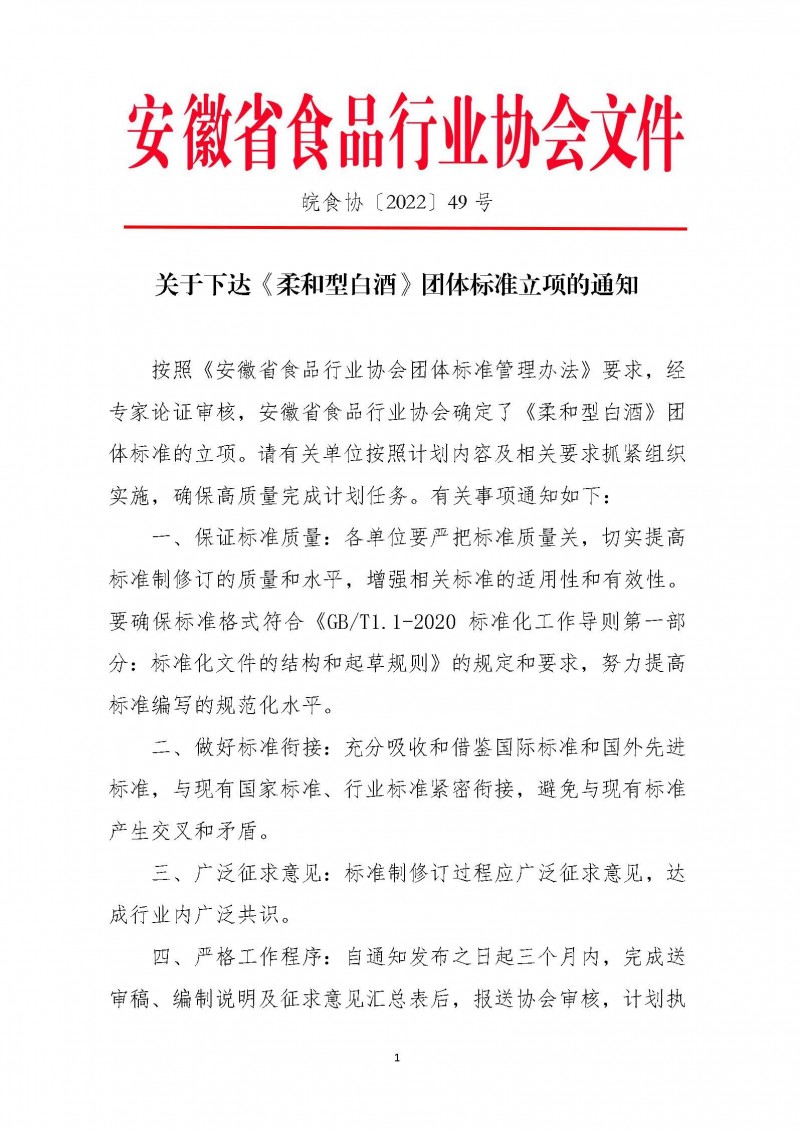 安徽省食品行業(yè)協(xié)會(huì)關(guān)于下達(dá)《柔和型白酒》團(tuán)體標(biāo)準(zhǔn)立項(xiàng)的通知(皖食協(xié)〔2022〕 49號(hào))