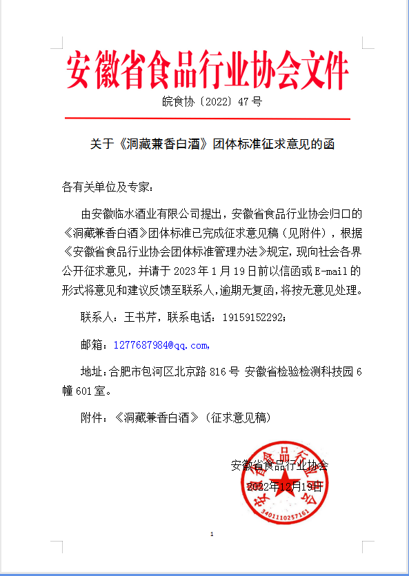 團(tuán)體標(biāo)準(zhǔn)已完成征求意見(jiàn)稿(見(jiàn)附件)﹐根據(jù)《安徽省食品行業(yè)協(xié)會(huì)團(tuán)體標(biāo)準(zhǔn)管理辦法》規(guī)定,現(xiàn)向社會(huì)各界公開征求意見(jiàn),截止2023年1月19日前。"/>