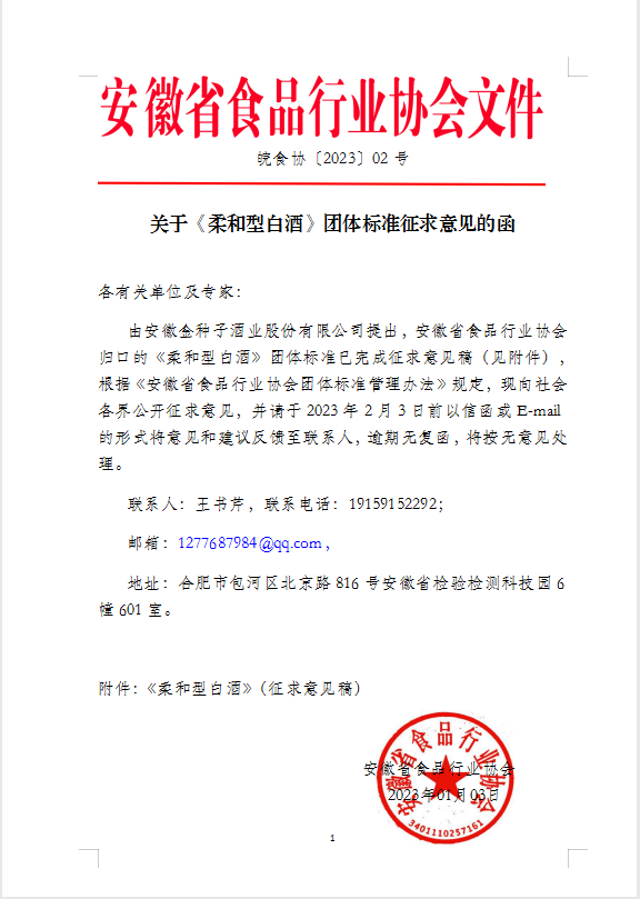 安徽省食品行業協會關于《柔和型白酒》團體標準征求意見的函(皖食協[2023]02號)