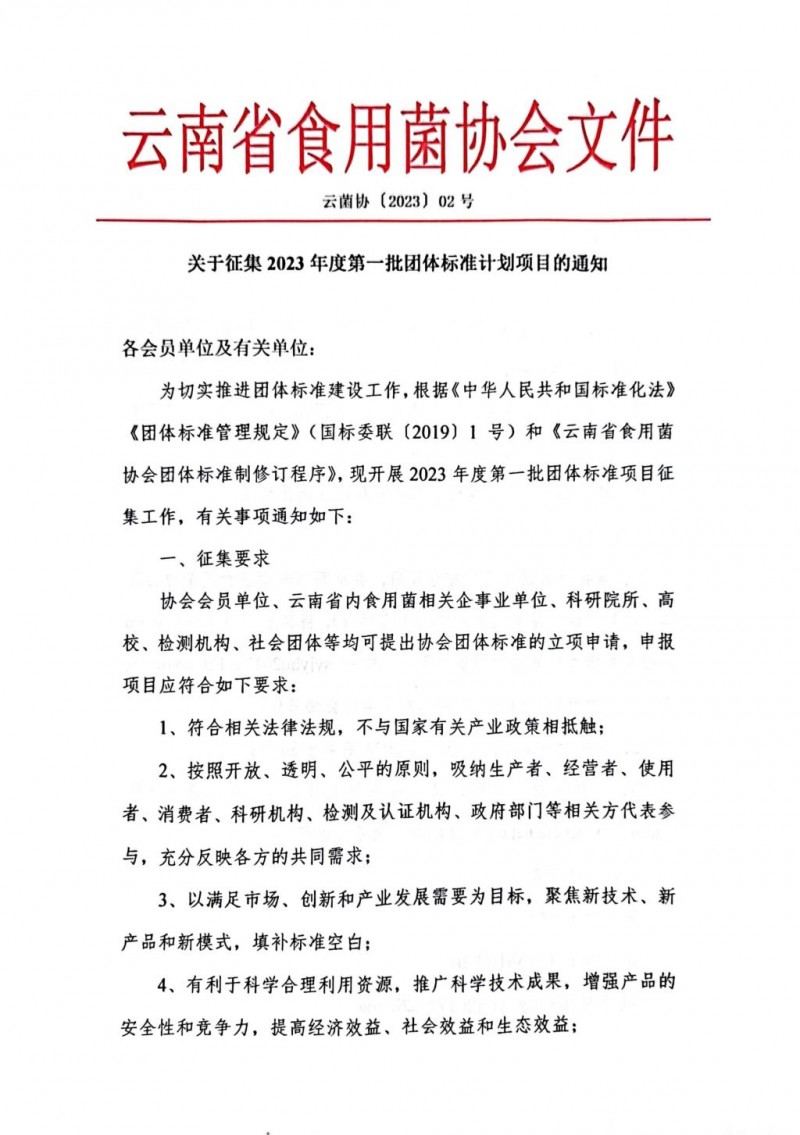 云南省食用菌協會關于征集2023年度第一批團體標準計劃項目的通知(云菌協[2023]02號)