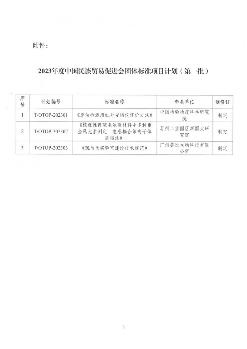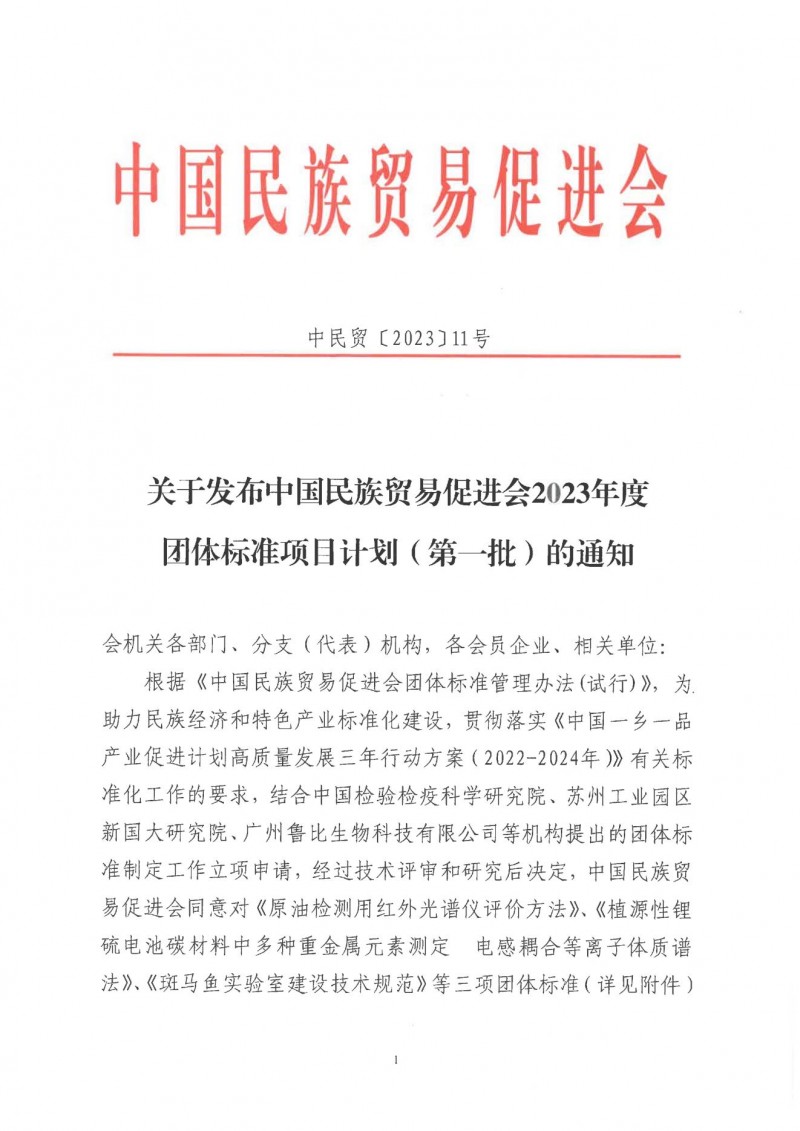 根據《中國民族貿易促進會團體標準管理辦法(試行)》,為助力民族經濟和特色產業標準化建設,貫徹落實《中國一鄉一品產業促進計劃高質量發展三年行動方案(2022-2024年)》有關標準化工作的要求,結合中國檢驗檢疫科學研究院、蘇州工業園區新國大研究院、廣州魯比生物科技有限公司等機構提出的團體標準制定工作立項申請,經過技術評審和研究后決定,中國民族貿易促進會同意對《原油檢測用紅外光譜儀評價方法》、《植源性鋰硫電池碳材料中多種重金屬元素測定 電感耦合等離子體質譜法》、《斑馬魚實驗室建設技術規范》等三項團體標準(詳見附件)予以立項。