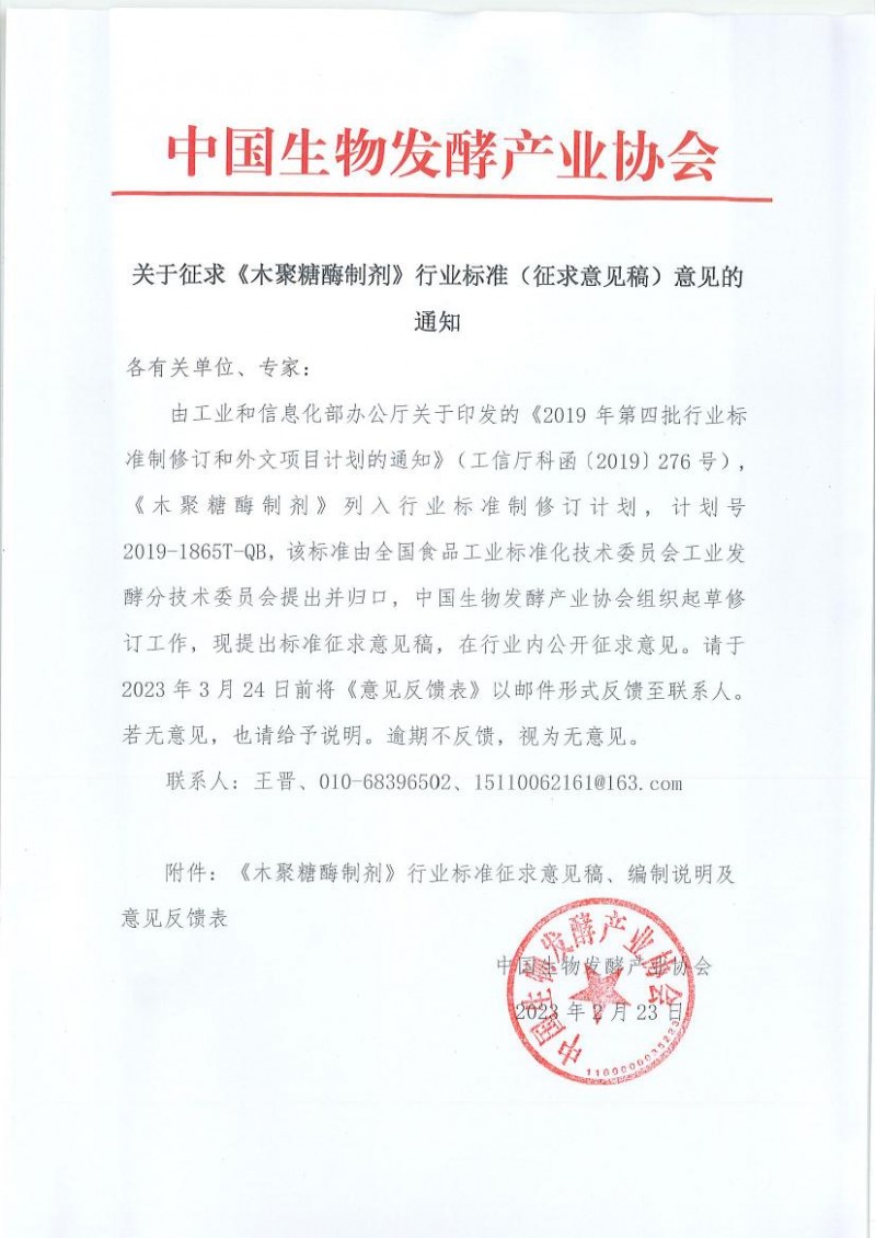 核心提示:中國生物發(fā)酵產業(yè)協(xié)會關于征求《木聚糖酶制劑》行業(yè)標準(征求意見稿)意見的通知,截止時間2023.3.24
