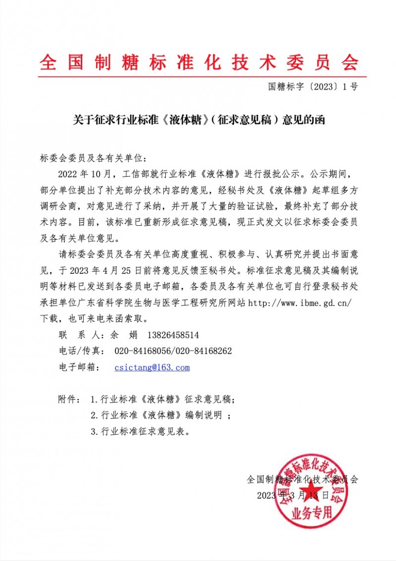 3月13日,全國制糖標準化技術委員會(以下簡稱標委會)發布《關于征求行業標準〈液體糖〉(征求意見稿)》,請標委會委員及各有關單位高度重視、積極參與、認真研究并提出書面意見,于2023年4月25日前將意見反饋至標委會秘書處。