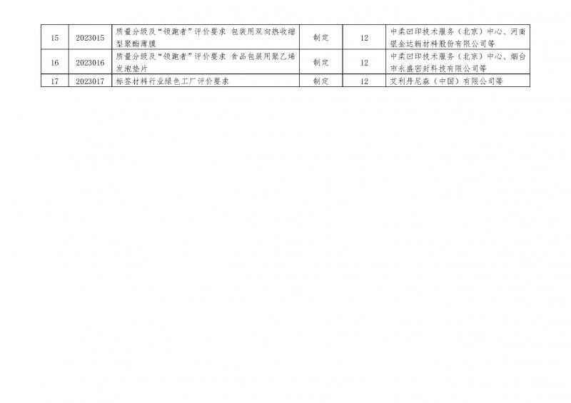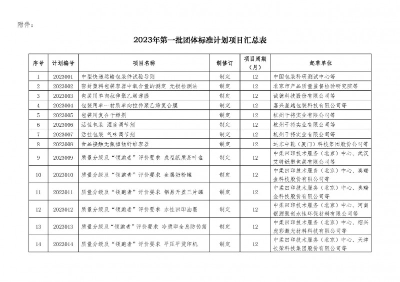 根據《中國包裝聯合會團體標準管理辦法》的要求,經研究,決定下達2023年第一批團體標準計劃項目,本批計劃項目共計17項,均為制定項目。