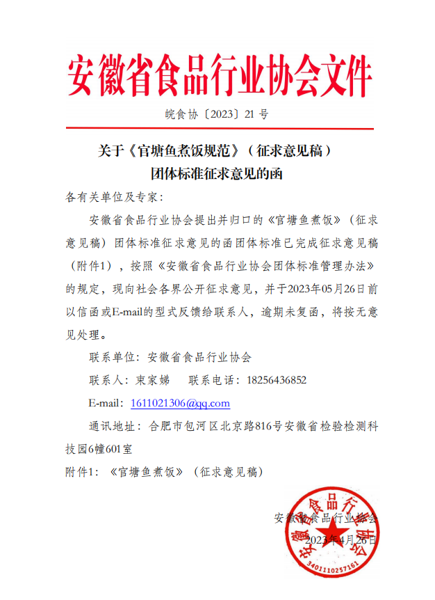 下載中心首頁 » 動態公告 » 標準動態 » 安徽省食品行業協會關于《官塘魚煮飯規范》(征求意見稿) 團體標準征求意見的函(皖食協〔2023〕21號)