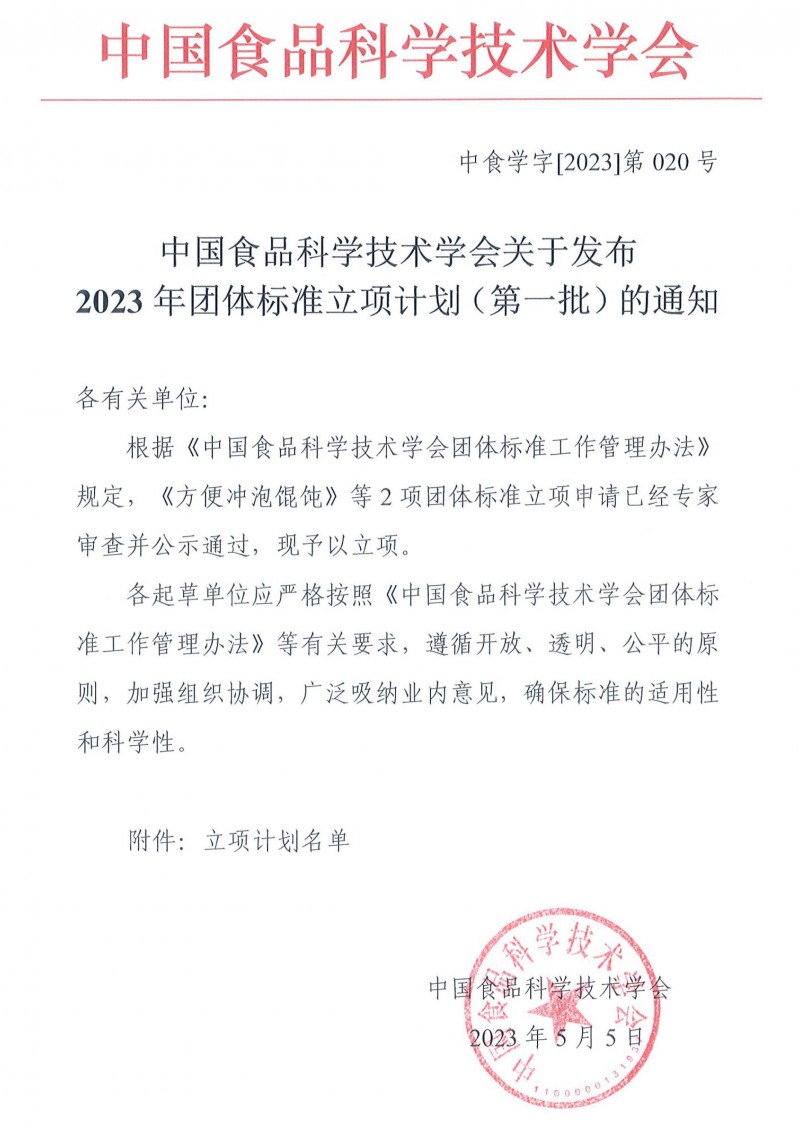 核心提示:中國食品科學技術學會關于發布2023年《方便沖泡餛飩》、《液體乳包裝用水煮型聚乙烯吹塑薄膜、袋》2項團體標準立項計劃(第一批)的通知(中食學字[2023]第020號)