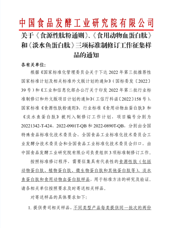中國食品發酵工業研究院有限公司關于《食源性肽粉通則》、《食用動物血蛋白肽》和《淡水魚蛋白肽》三項標準制修訂工作征集樣品的通知