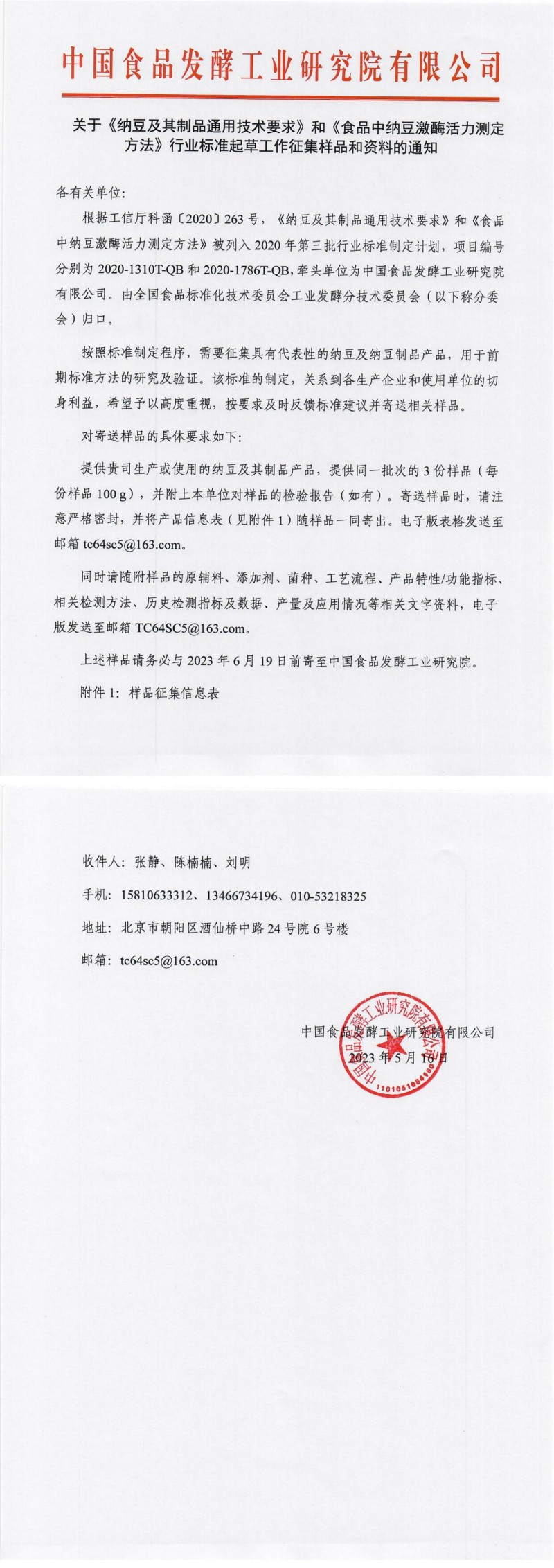 中國食品發酵工業研究院有限公司關于《納豆及其制品通用技術要求》和《食品中納豆激酶活力測定方法》行業標準起草工作征集樣品和資料的通知