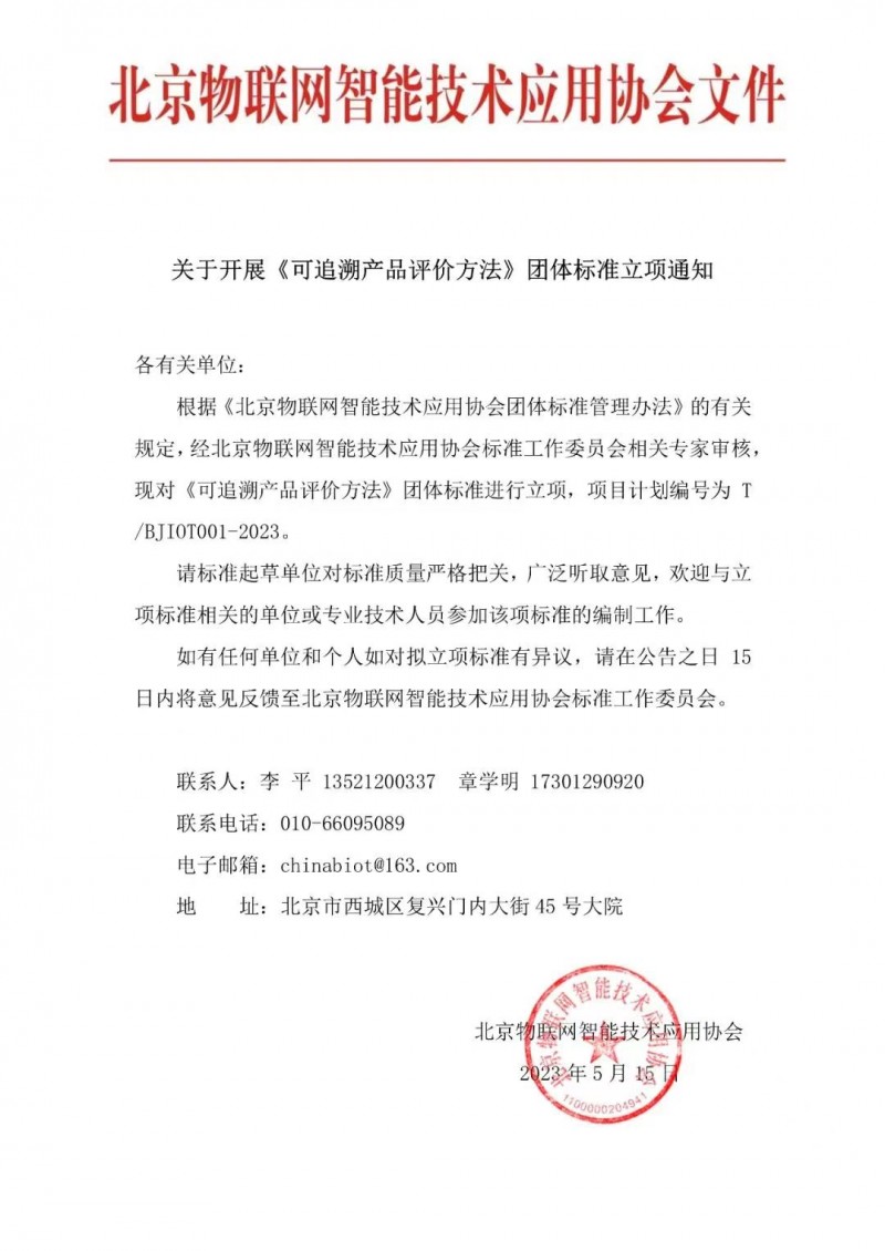 北京物聯網智能技術應用協會關于開展《可追溯產品評價方法》團體標準立項通知