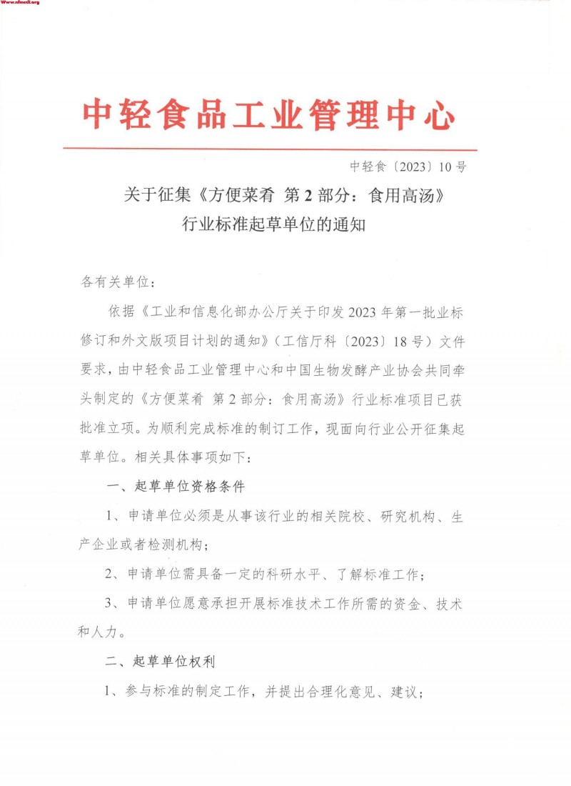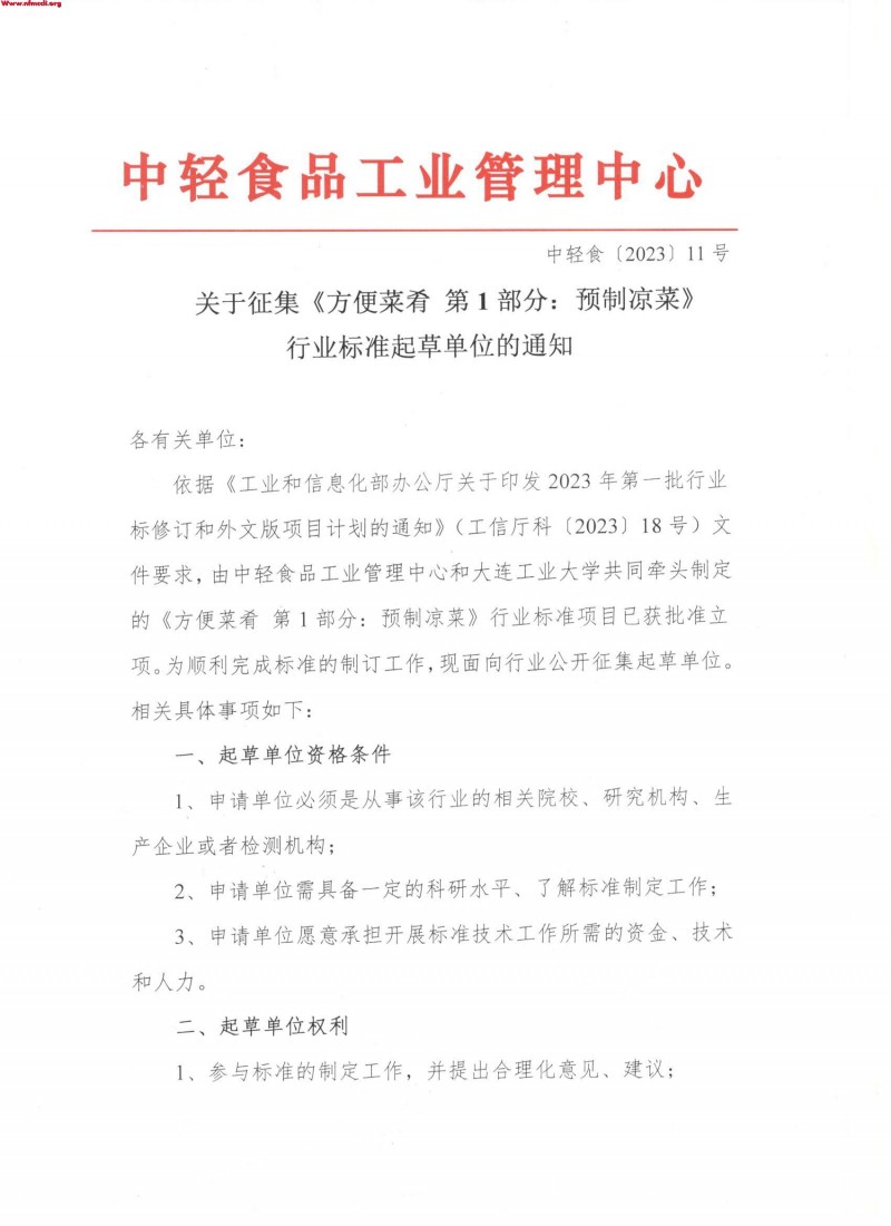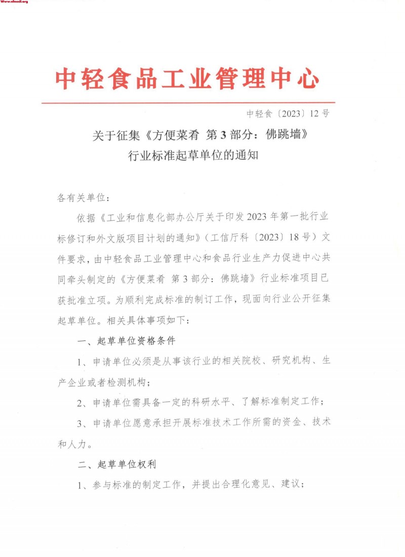 中輕食品工業管理中心關于征集《方便菜肴 第1部分:預制涼菜》《方便菜肴 第2部分:食用高湯》、《方便菜肴 第3部分:佛跳墻》行業標準征集起草單位的通知