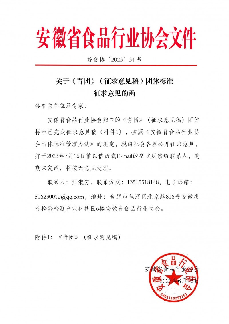 安徽省食品行業協會關于《青團》(征求意見稿)團體標準 征求意見的函(皖食協[2023]34號)